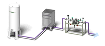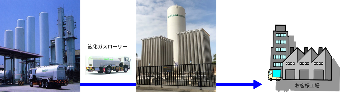 CE(真空断熱貯槽)内に、タンクローリーより液化ガスを受入れ、超低温の液化状態で貯蔵します。供給時は、ガス内圧により液体を送り出し、アルミ製の気化器により大気と熱交換し気化させた後、減圧設備で所定の圧力まで調整しガスを供給します。
