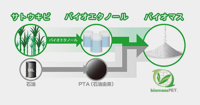 バイオマスPET樹脂は、PET樹脂の成分のうち、30%を植物由来で構成した環境配慮型のPET樹脂です。